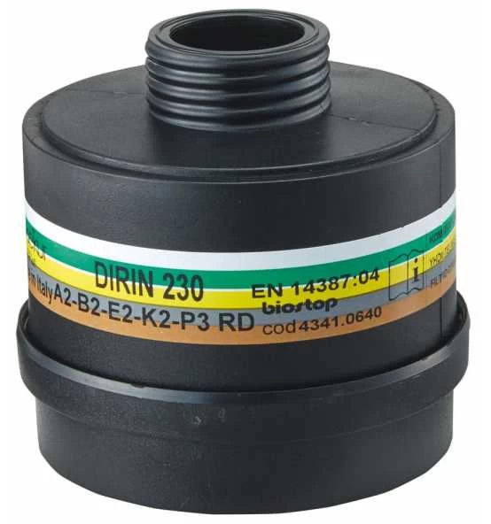 Schutz gegen organische Gase und Dämpfe mit einem Siedepunkt von über 65 °C, anorganische Gase und Dämpfe, Schwefeldioxid und Ammoniak sowie Partikel giftiger und hochgiftiger Stoffe (P3), mit innovativem BIOSTOP, mit Rundgewinde DIN EN 148-1. BIOSTOP verhindert das Durchwachsen von Bakterien und/oder Pilzen durch das Filtermaterial.