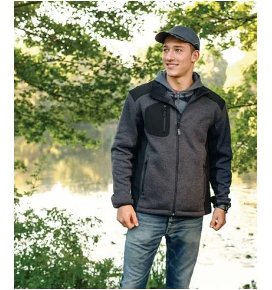 Strickjacke »INNSBRUCK« Ausführung: • Hoch atmungsaktiv • Weich und komfortabel • Leichte Jacke mit Strick-Außenseite und Fleece-Innenseite • Softshell-Verstärkungen • Kinnschutz • Elastischer Kordelzug im Saum mit Stoppern • Elastische Ärmelabschlüsse • Eine aufgesetzte Brusttasche mit Reißverschluss • 2 seitliche Hüfttaschen mit Reißverschlüssen Material: 100 % Polyester, Strickfleece; Einsatz: 96 % Polyester, 4 % Elasthan, ca. 320g/m² Farbe: grau-schwar
