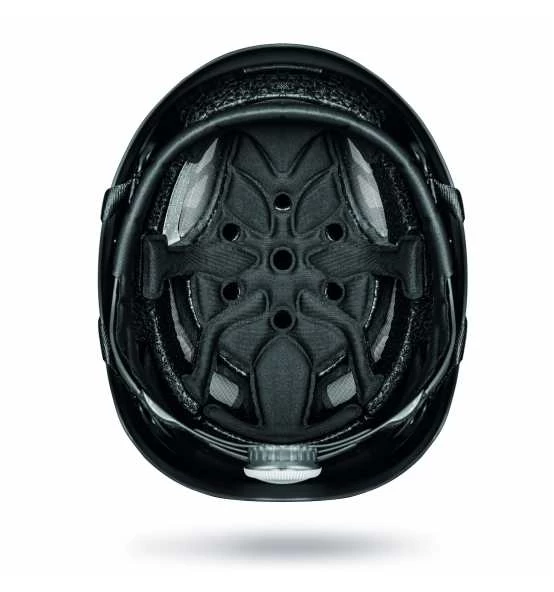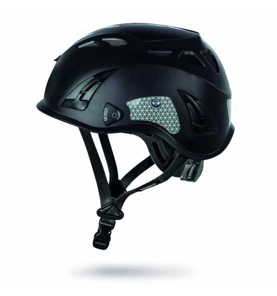 - Kinnriemen mit vier Befestigungspunkten, hinten verkreuzt für eine bessere Befestigung des Helms am Kopf. Schnellverschluss und Schnellöffnung gemäss EN 12492. Seitliche Justierung für die Längeneinstellung der Bänder.